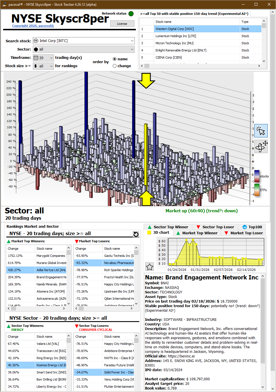 With the launch of NYSE Skyscr8per, paceval. shows what becomes possible when mathematical precision meets visual clarity. The application presents a three-dimensional view of the entire NYSE stock universe that feels immediate, compact and easy to explore. It also includes experimental AI-based analysis that highlights stable market patterns and supports deeper exploration.