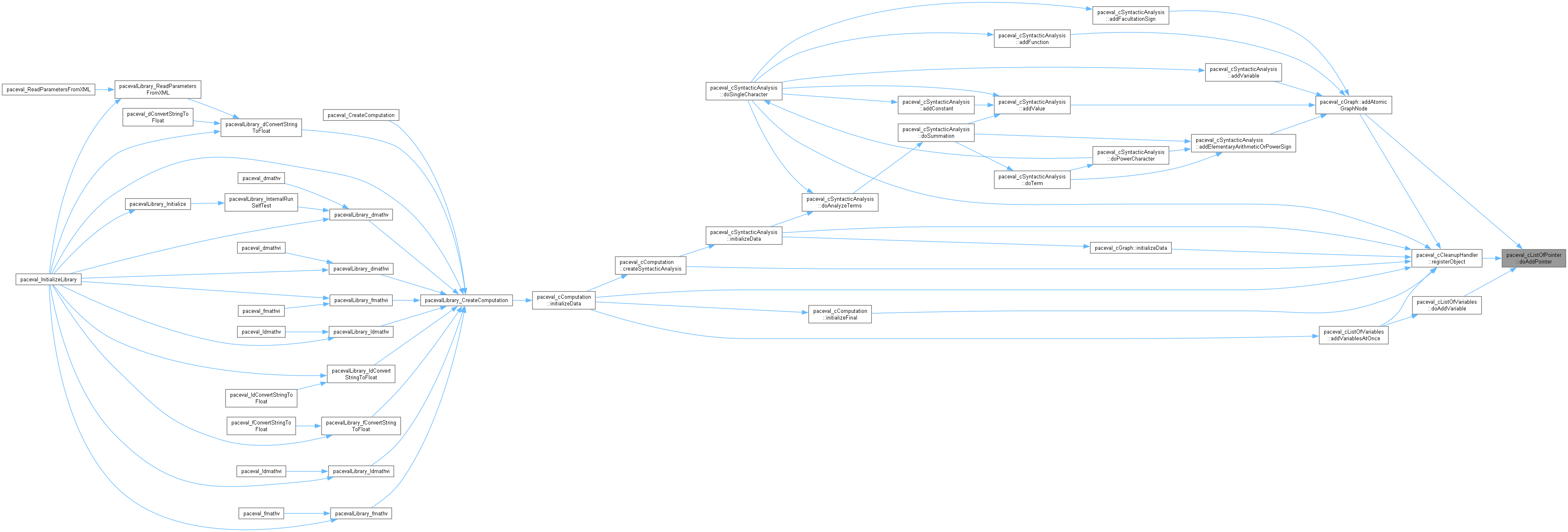 The class paceval_cListOfPointer is derived from paceval_cRegisteredObject and encapsulates the storage of a list of pointers to objects, such as the list of nodes in paceval_cGraph, the list of pointers in paceval_cListOfVariables or the list of registered objects in paceval_cCleanupHandler.